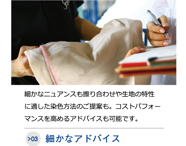 生地の染色や特殊・後加工、展示会用の着分見本等の10mから小ロットでの染色や奇数反を含めた量産加工についてお気軽にお問合せください。