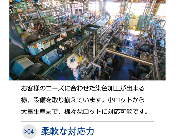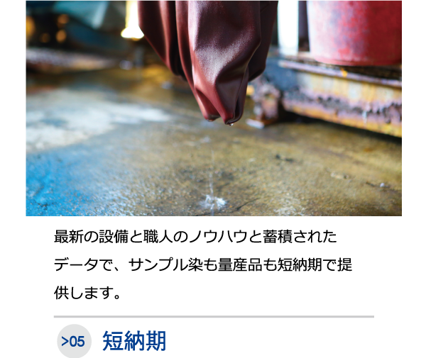 生地の染色や特殊・後加工、展示会用の着分見本等の10mから小ロットでの染色や奇数反を含めた量産加工についてお気軽にお問合せください。